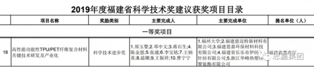 近日,福建省政府發(fā)布《關(guān)于2019年度福建省科學(xué)技術(shù)獎評審結(jié)果的公示》,福建思嘉環(huán)保材料科技有限公司與福州大學(xué)、福建恩邁特新材料有限公司、福建省長樂市伊紡達(dá)針織有限公司、浙江華峰熱塑性聚氨酯有限公司等合作研發(fā)的“高性能功能性TPU/PET纖維復(fù)合材料關(guān)鍵技術(shù)研發(fā)及產(chǎn)業(yè)化”項目榮獲福建省科學(xué)技術(shù)進(jìn)步一等獎。