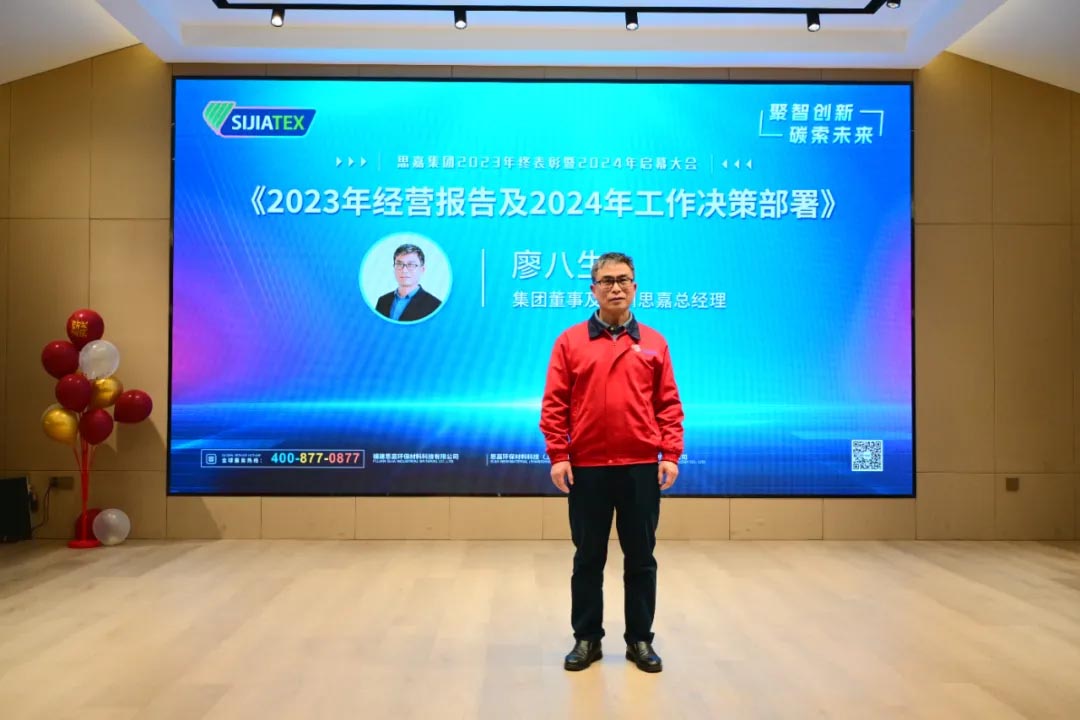 福建思嘉總經(jīng)理廖八生、集團材料技術(shù)研究院院長姚興南、集團事業(yè)部董事總經(jīng)理王兆柚上臺,分別從企業(yè)全年業(yè)績情況、材料技術(shù)研發(fā)、國際市場開發(fā)等方面做2023年度總結(jié)及2024年重點工作規(guī)劃。